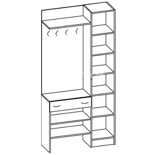 Очень лаконичная прихожая Валерия-1 станет идеальным местом для ваших вещей. Она выполнена в виде открытой стенки, на вертикальную заднюю панель которой крепиться полка для головных уборов и четыре двухрожковых крючка. Нижняя часть прихожей Валерия-1 представлена в виде небольшой тумбы с выдвижным ящичком и двух открытых полок под ним. Полки можно использовать для хранения обуви, они расположены таким образом, что под ними образуется еще одна ниша для обуви. Справа от тумбы прихожей Валерия-1 встроен высокий пенал, дверь которого украшена зеркальной панелью. За дверью пенала прихожей Валерия-1 расположены полки.
