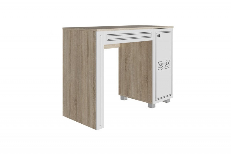 Особенности стола: Материал корпуса - ЛДСП 16 мм., материал фасада - МДФ 16 мм. Стол состоит из закрытой тумбы с полкой справа и потайного отсека для хранения, при открывании которого появляется зеркало, расположенное на обратной стороне открывающейся крышки. Крышка открывается при помощи газлифта.